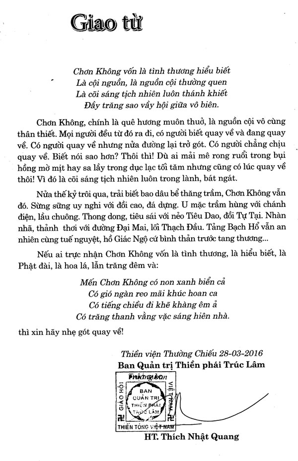 Chơn Không, chính là quê hương muôn thuở, là nguồn cội vô cùng thân thiết. Mọi người đều từ đó ra đi, có người biết quay về và đang quay về. Có người quay về nhưng nửa đường lại trở gót. Có người chẳng chịu quay về. Biết nói sao hơn? Thôi thì! Dù ai mải mê rong ruổi trong bụi hồng mờ mịt hay sa lầy trong dục lạc tối tăm nhưng cũng có lúc quay về thôi! Vì đó là cõi sáng tịch nhiên luôn trong lành, bát ngát.